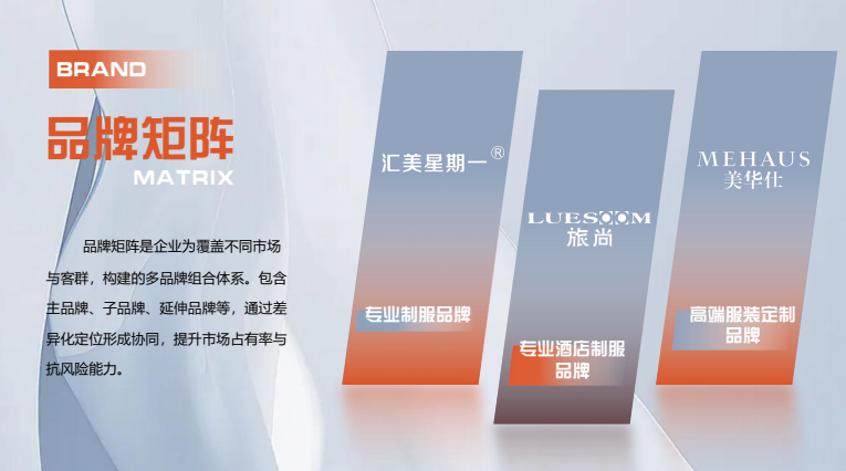 基于对产品的精细化运作,星期一制服打造多渠道、多品牌的职业时装的梦想蓝图。目前,星期一旗下拥有三大品牌:汇美星期一:泛指所有职业时装品牌,品牌寓意星期一为每周上班第一天,职业必须要穿的,这是职业装的一个重要起点;旅尚LUESOOM:专业酒店制服品牌,寓意酒店(旅业)的时尚源泉;美华仕MEHAUS:高级服装定制品牌,旨在为品位高雅、追求完美生活品质的现代都市情怀,职场精英定制的奢华品牌。三大品牌各自的精准定位,形成了不同的市场战略和发展路线。多品牌战略的成功规划和实施,将使星期一成功提升为高设计含量、高附加值的时尚创意型企业。