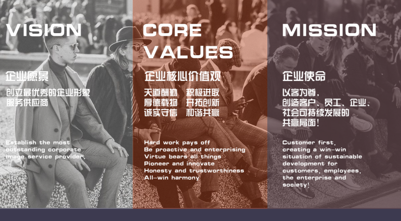 我们的口号:星期一穿制服。源自打造最美职业形象的内心热爱,是对职业时尚艺术持之以恒的追求,对产品精益求精,对穿着者细心呵护。达成顾客的需求为标准,实现顾客对本职工作的狂热追逐,成为各行各业的中流砥柱。